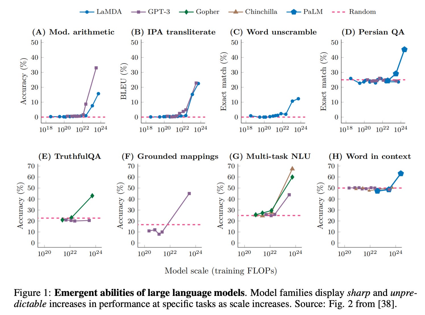 Though emergent properties1 have been observed in large language models, this paper shows that: “emergent abilities seem to appear only under metrics that nonlinearly or discontinuously scale any model’s per-token error rate.” Because when they change to other metrics, that spike in performance no longer exists.