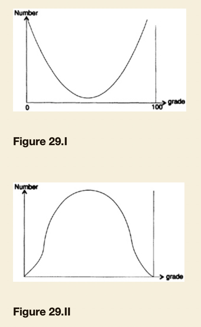 In giving a final exam in a course, say in the calculus, I can get almost any distribution of grades I want. If I could make up an exam which was uniformly hard, then each student would tend either to get all the answers right or all wrong. Hence I will get a distribution of grades which peaks up at both ends. If, on the contrary, I asked a few easy questions, many moderately hard, and a few very hard ones, I would get the typical normal distribution; a few at each end and most of the grades in the middle.