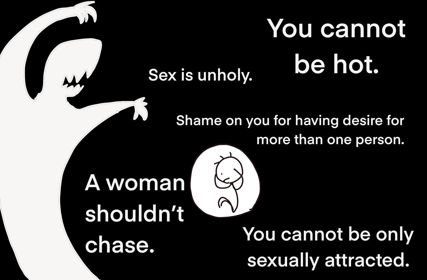 The rules I absorbed without knowing I’d absorbed them: I wasn’t allowed to feel sexually attracted to someone before finding admirable qualities in them first. I felt guilty for noticing other people while already in a relationship. My desire was unholy. Sex could only exist as a sacred union. I could be beautiful, even wholesome, but not hot. And a woman couldn’t chase; she waited to be found.