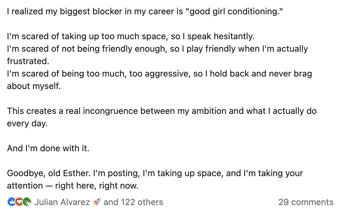 Now I post on LinkedIn every few days. Not because I have everything figured out, but because I want to take up space. I’m training the muscle of taking up space.