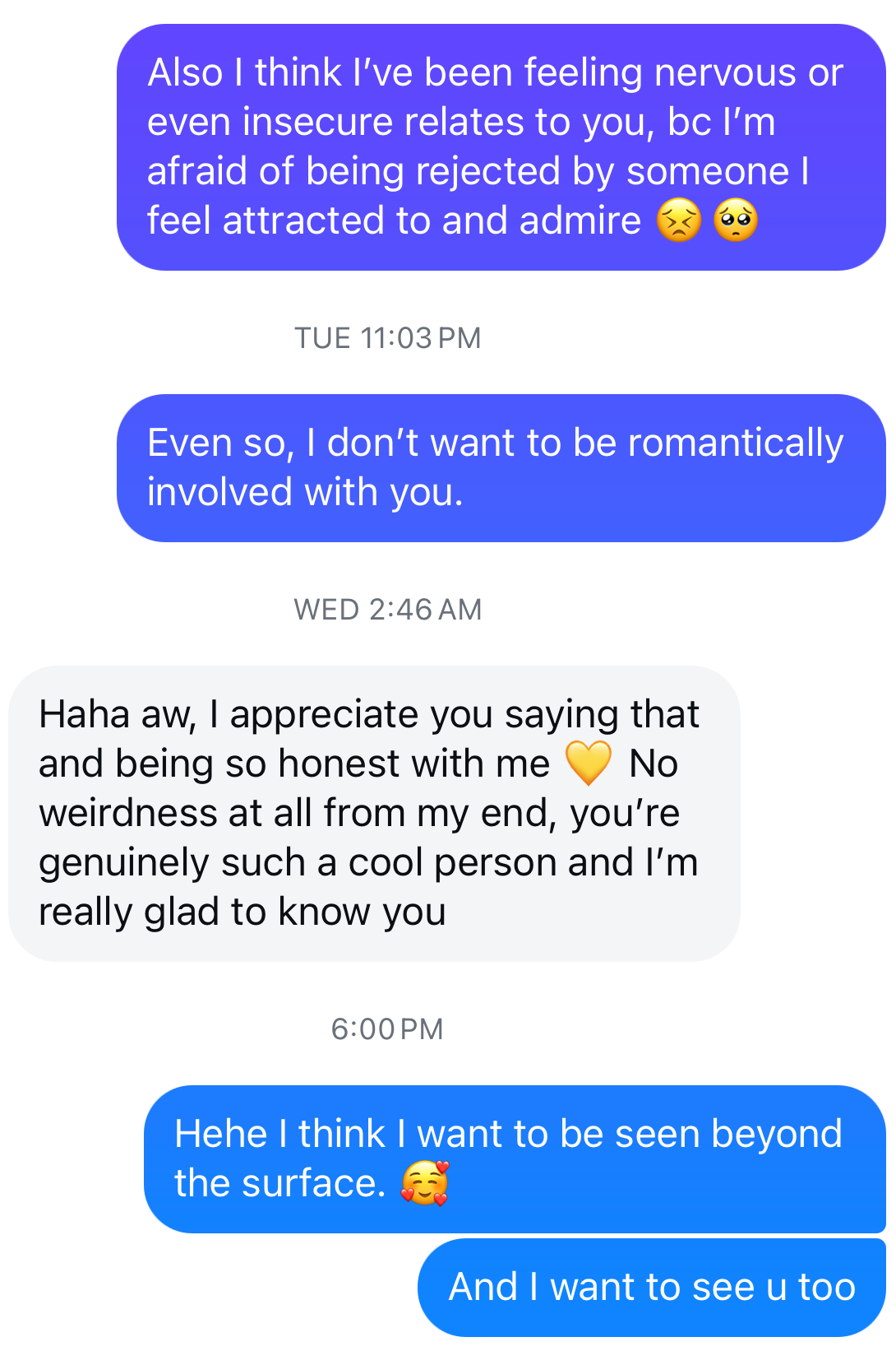 Even with the person I had the biggest crush on for a year, the hottest person I knew, I found the courage to talk about it. It’s terrifying. But going wrong in your own way is better than going right in someone else’s.