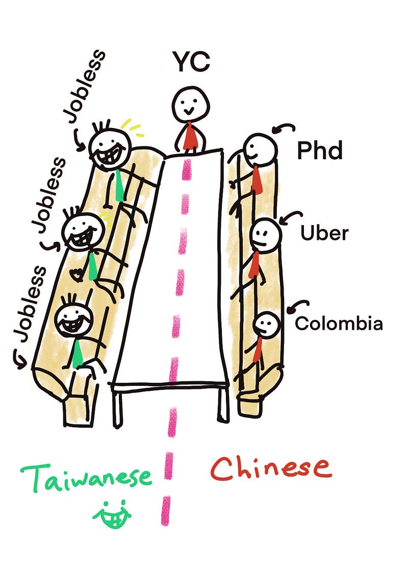 幾個禮拜前,和一個創業有進 YC 的中國學姊吃飯。在坐六個人,我們三個台灣人、和三個中國同學。結果,哎呀,發現一條線切開來,中國全部有工作、不是PhD、Colombia、就是 Uber ,但是,三個台灣人都沒工作。自己發現這條線的台灣同學自己講還自己覺得很好笑,事實上時,整桌的台灣人都失業了還一起笑得很開心……