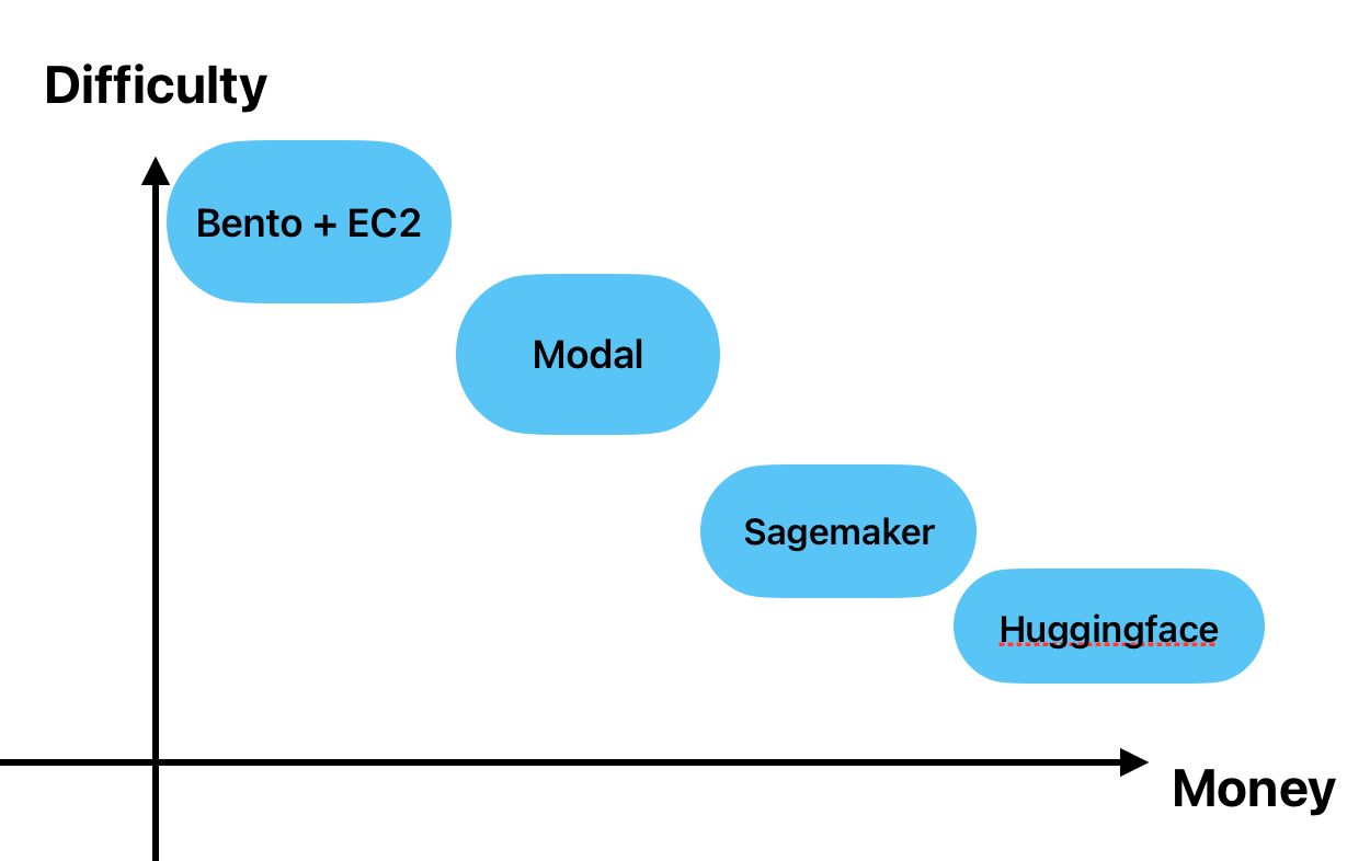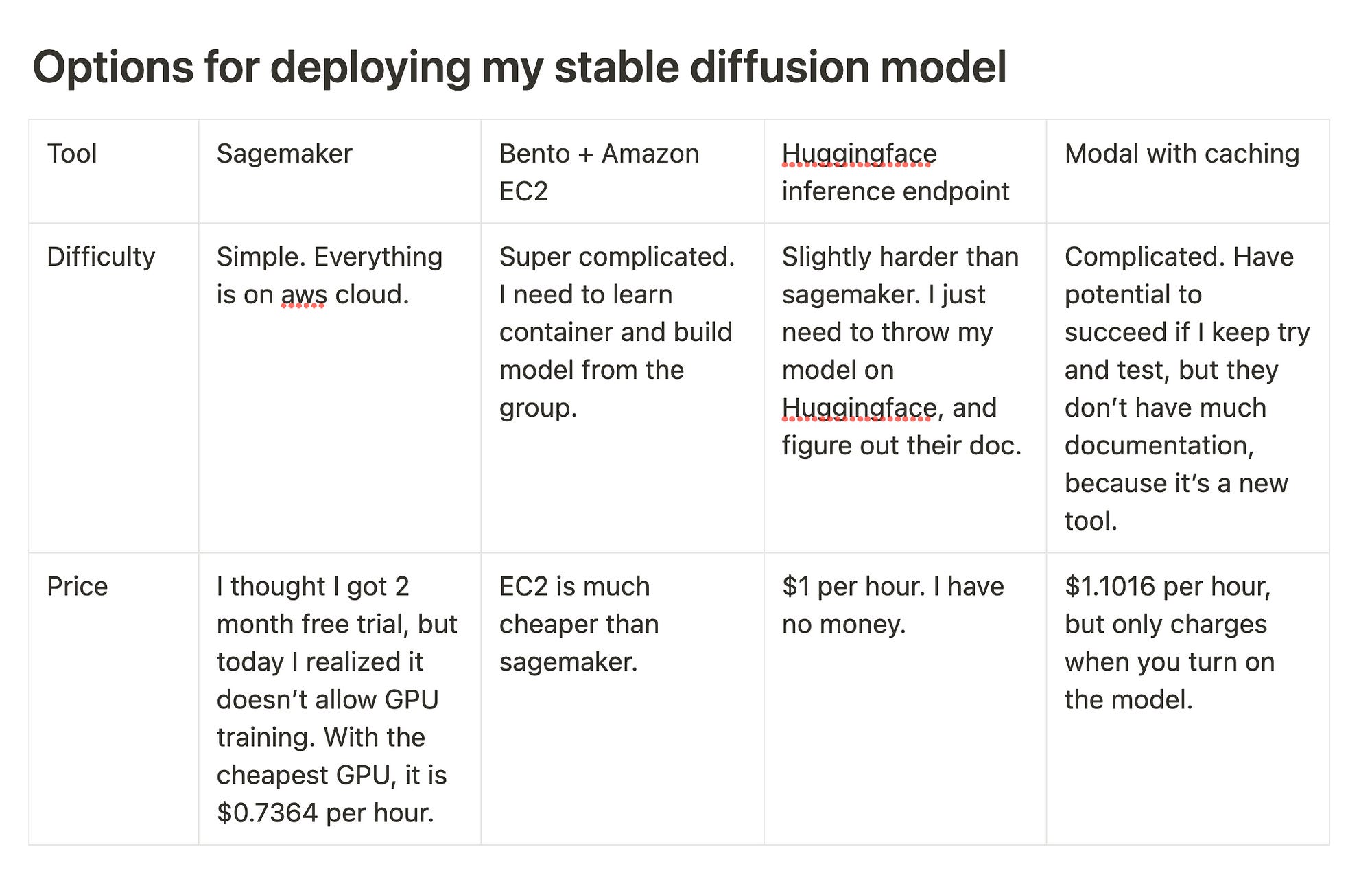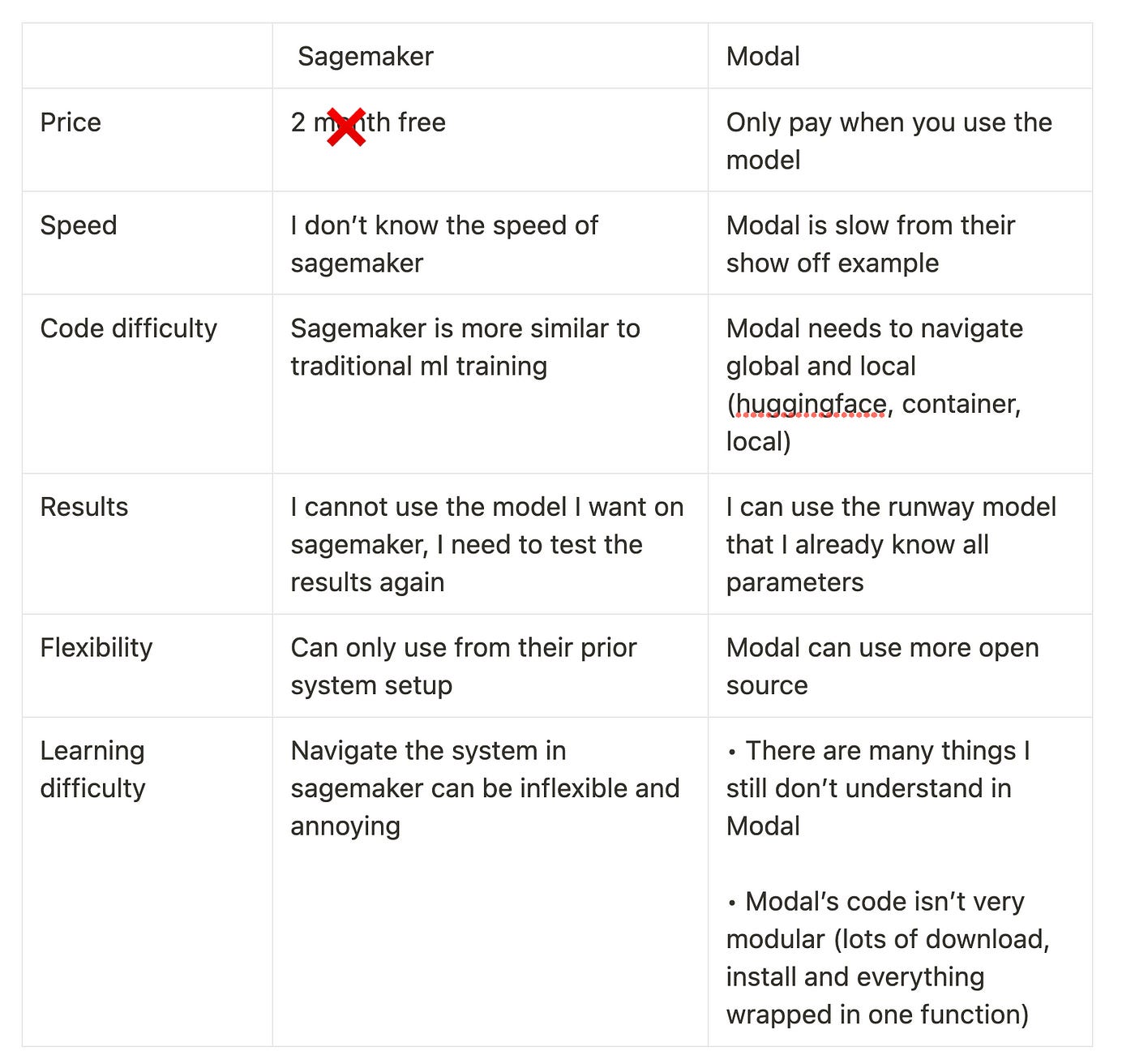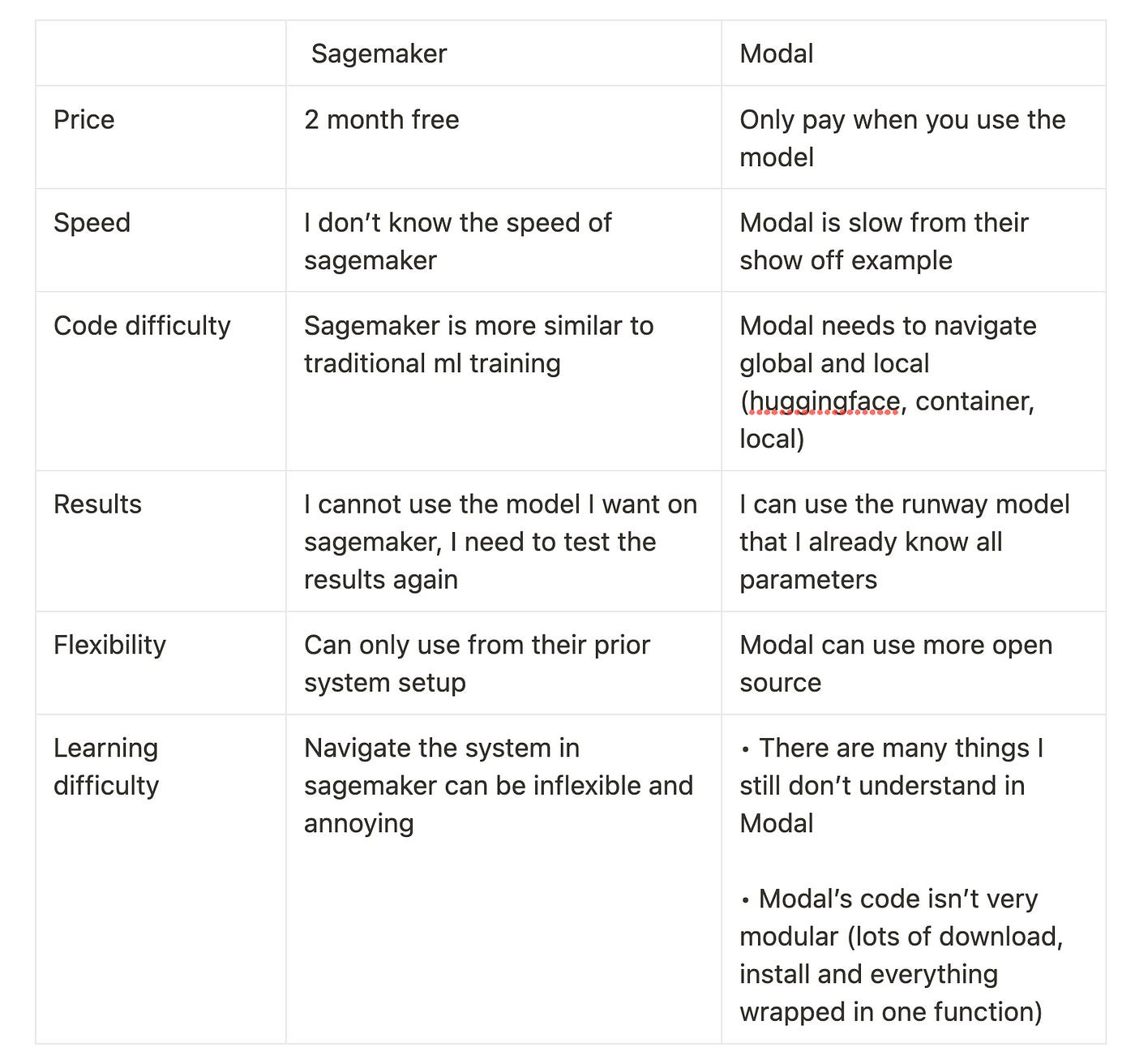 Initially, I excluded Hugging Face due to its high cost and Bento + EC2 due to its complexity. Therefore, I narrowed down my options to Modal and Sagemaker. I generated a technical plan for each tool to compare and decide which one to use for the project.