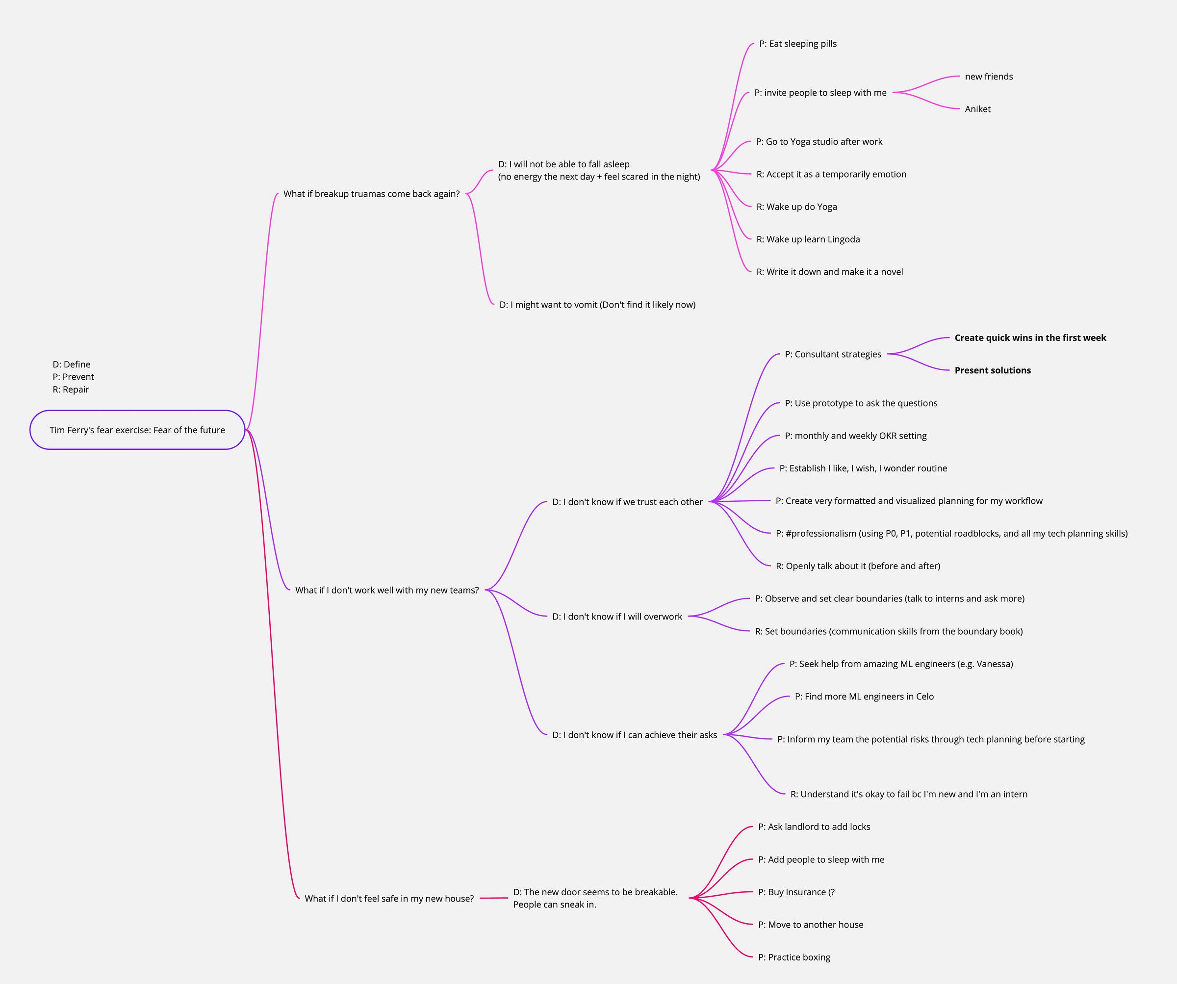Now, it is time to brainstorm solutions to all my fears. I used Tim Ferriss's fear exercise to break it down. In short, this exercise is to define your fear, think about how to prevent it, and how to repair it if it happens.