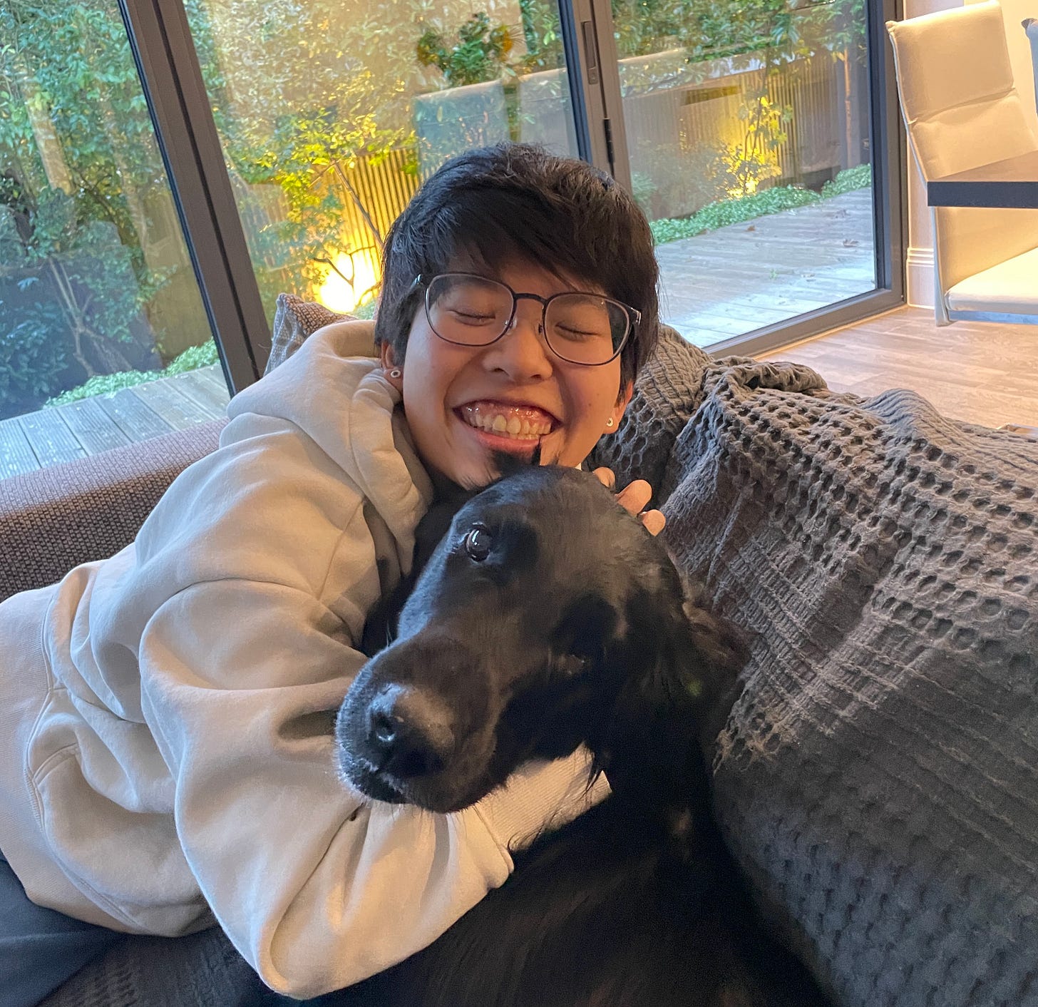 We went inside the house. J’s mom gave me a big warm hug and cooked me with British dinner. I cuddled with their black golden retriever. She licked my entire palm. I felt safe because I felt at home.