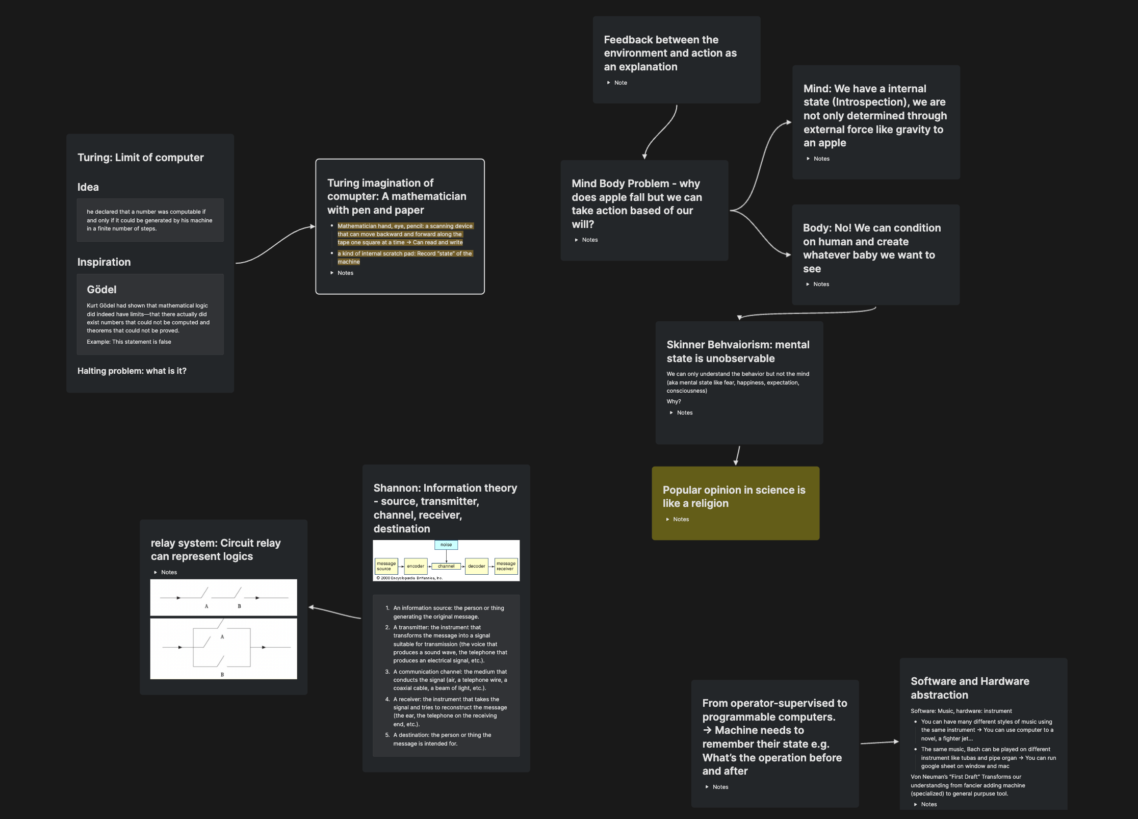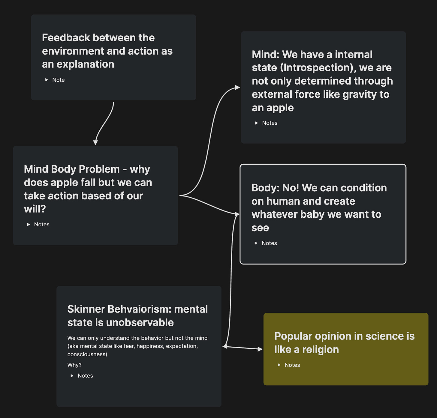 For instance, my current notes about the Mind-Body Problem are all related to each other with book notes as supporting evidence. Yet, they are all interconnected without a structure.