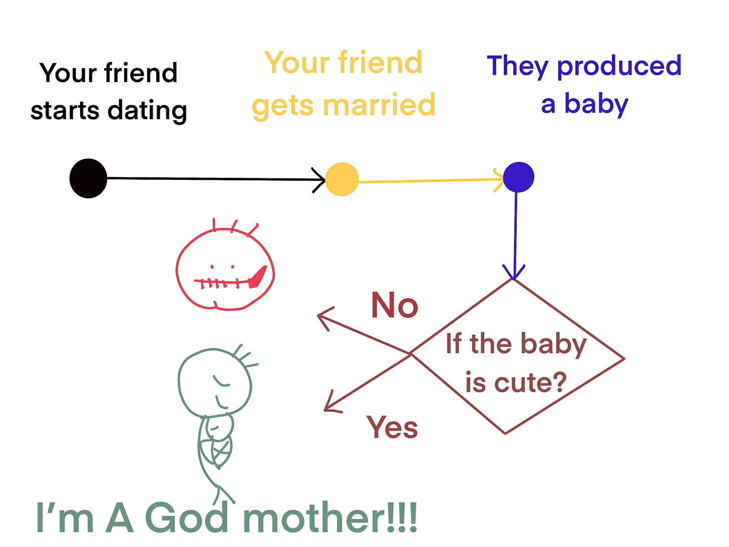 Let me lay out my thinking process. Right now, my friends are in their first stage: They're starting to date. Sooner or later, they're going to reach stage three: They'll have a baby. In that case, I might by no means be ready for it!