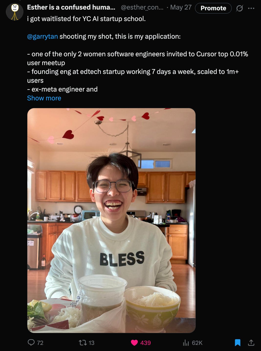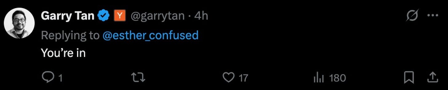 People started tagging YC’s CEO, Garry Tan, saying things like, “Let this incredible woman in!” Friends were vouching for me, sharing the tweet, spreading the word.