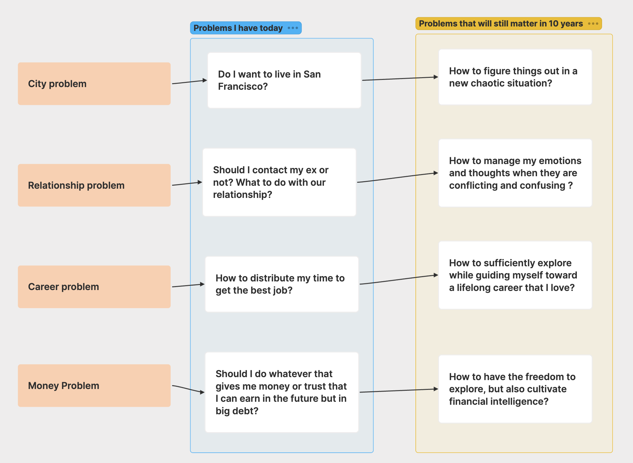 Even though I decided to live in San Francisco after graduation, I hate how unsafe I feel here. Engineering people bore me. Also, I started to get annoyed by run run run to build a startup mindset when everyone is so stressed that no one has the energy to take care of each other. However, will I still be worrying about whether I want to live in San Francisco in 10 years? I don’t think so. But will I care about how to navigate in a new messy and chaotic situation? Absolutely yes. Some ideas therefore pop up from this new question: