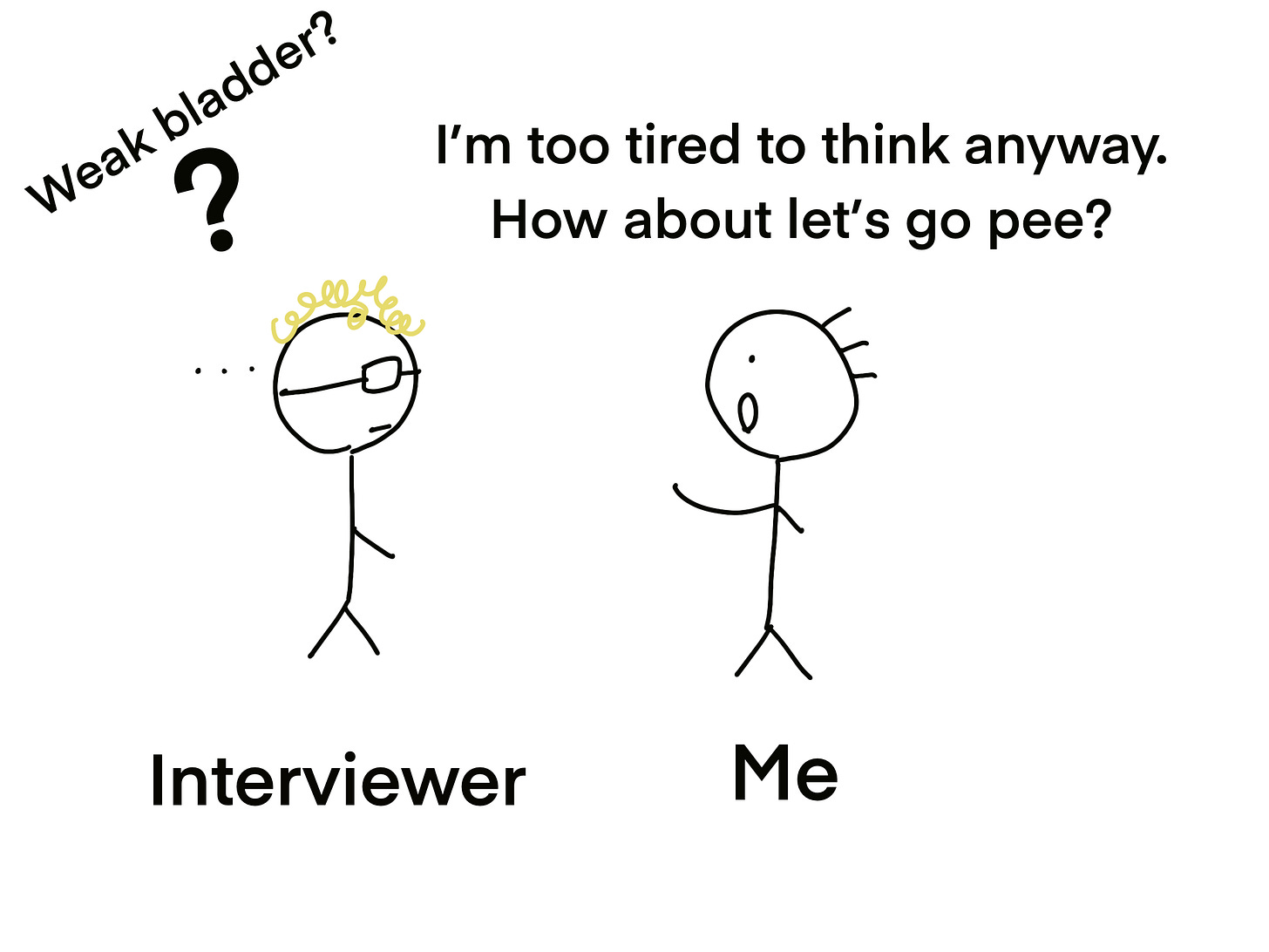 In one interview, as I was tired and could not solved the problem, rather than feeling anxious, I told the interviewer, “I’m tired and cannot think now. Can we take a break?” And then we took a bathroom break and chatted. I solved that problem in the last 8 minutes.