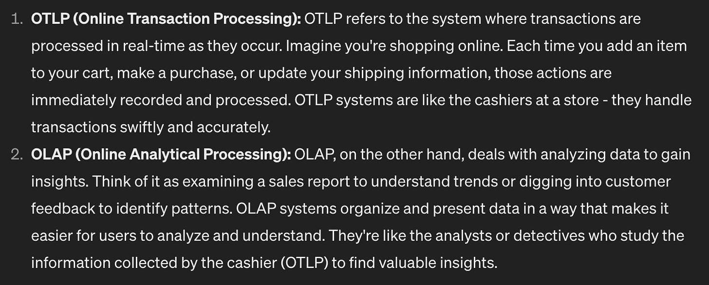 Whenever I finish learning 1 concept, I usually write a paragraph that I digest myself. For instance, this is my OLTP vs OLAP learning.