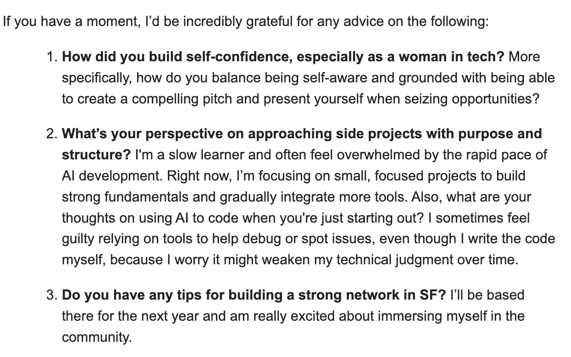 Another reader once slid into my Twitter DMs, and we decided to meet for coffee. Over lattes, I told her my story about selling matcha at YC’s AI Startup School. She laughed and shared her own hustle, selling souvenirs at a Taylor Swift concert… until the police caught her.
