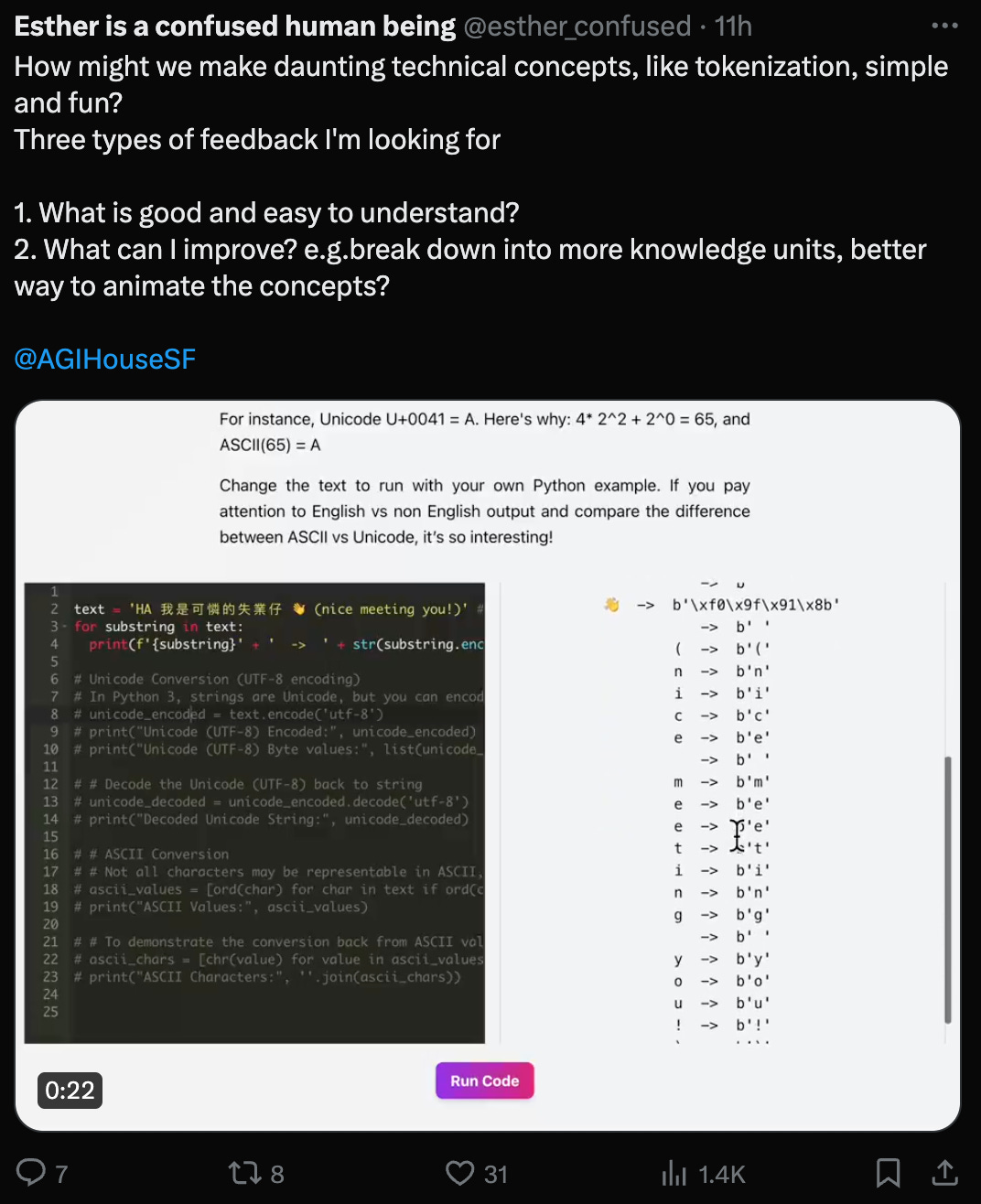 Usually, she went to hackathons to work on her own project without presenting because she was too shy and felt other people were famous and good. The hackathon yesterday was a supportive one where we learned how to launch in public and comment, share, and like each other's Twitter, GitHub, Product Hunt, and HackerNews. And she gave it a try!