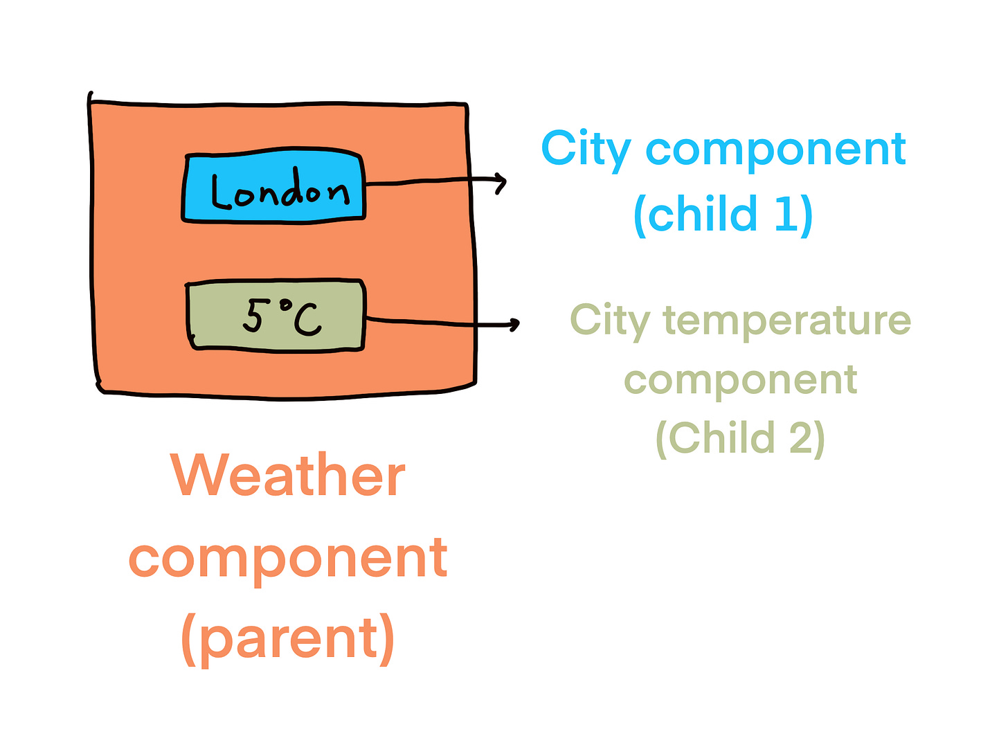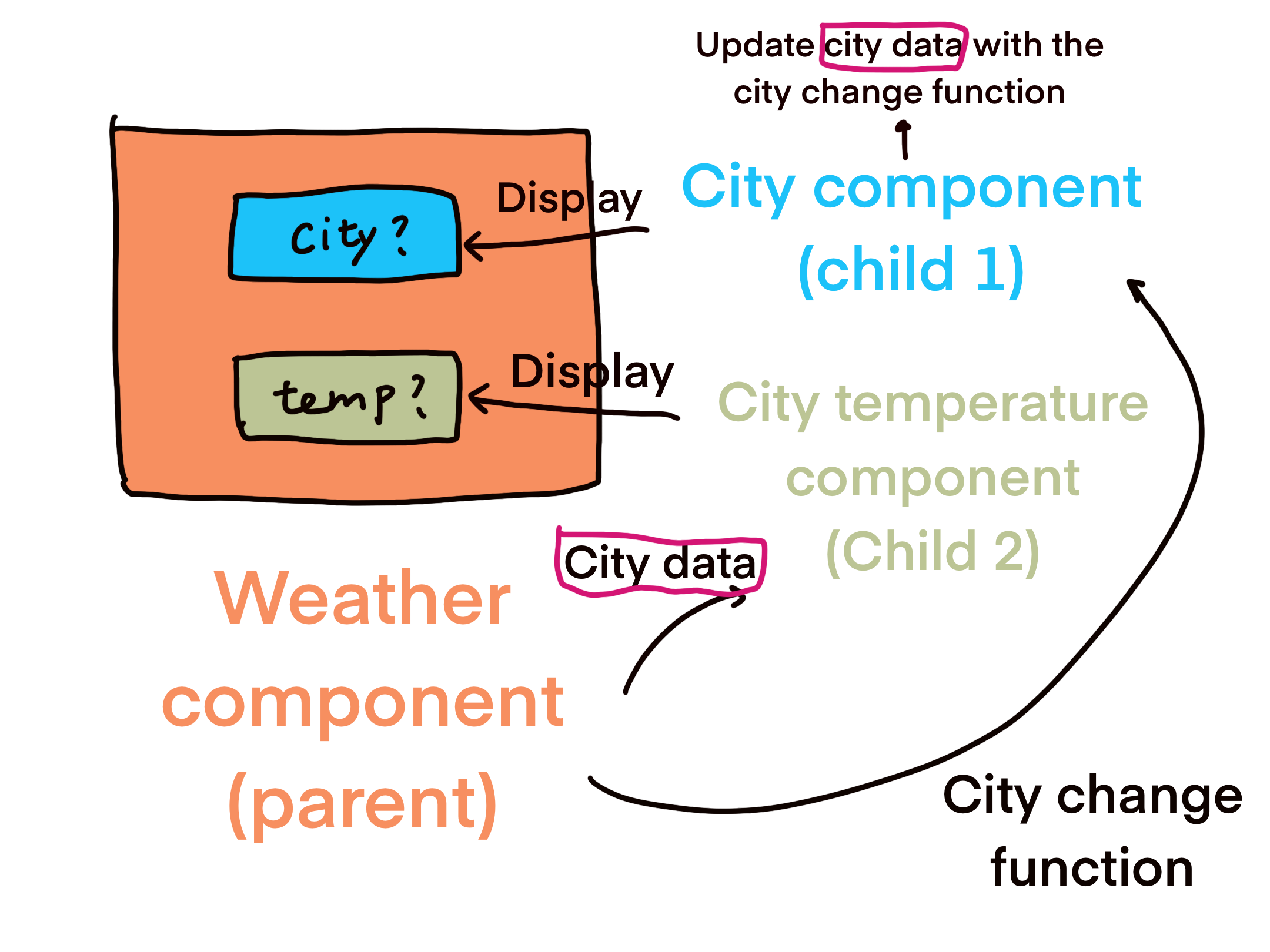 CityInput - (observes an event and tells parent) -> WeatherApp - (updates state and informs WeatherDisplay) -> WeatherDisplayIt's two communication lanes that form a cycle: