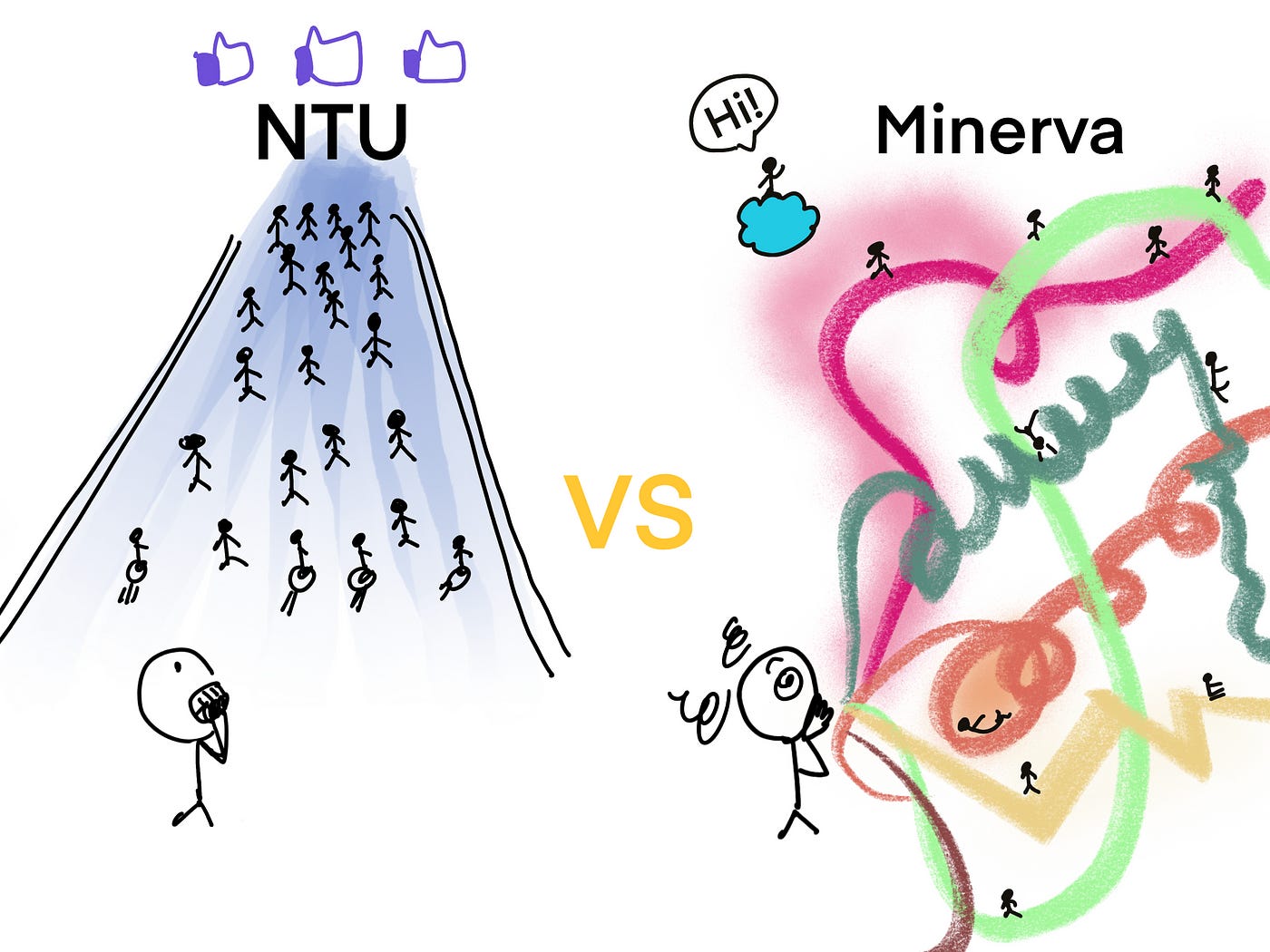 看起來雖然好笑,但不要小看環境的重要,去年我們班上 150 個人,光是收到 Meta 錄取信的就有將近十人。但是這篇文章,我想要跳脫單純社會成就的比較,把我所看見的台大環境和 Minerva 的環境以文化和困境做更細緻的對比。