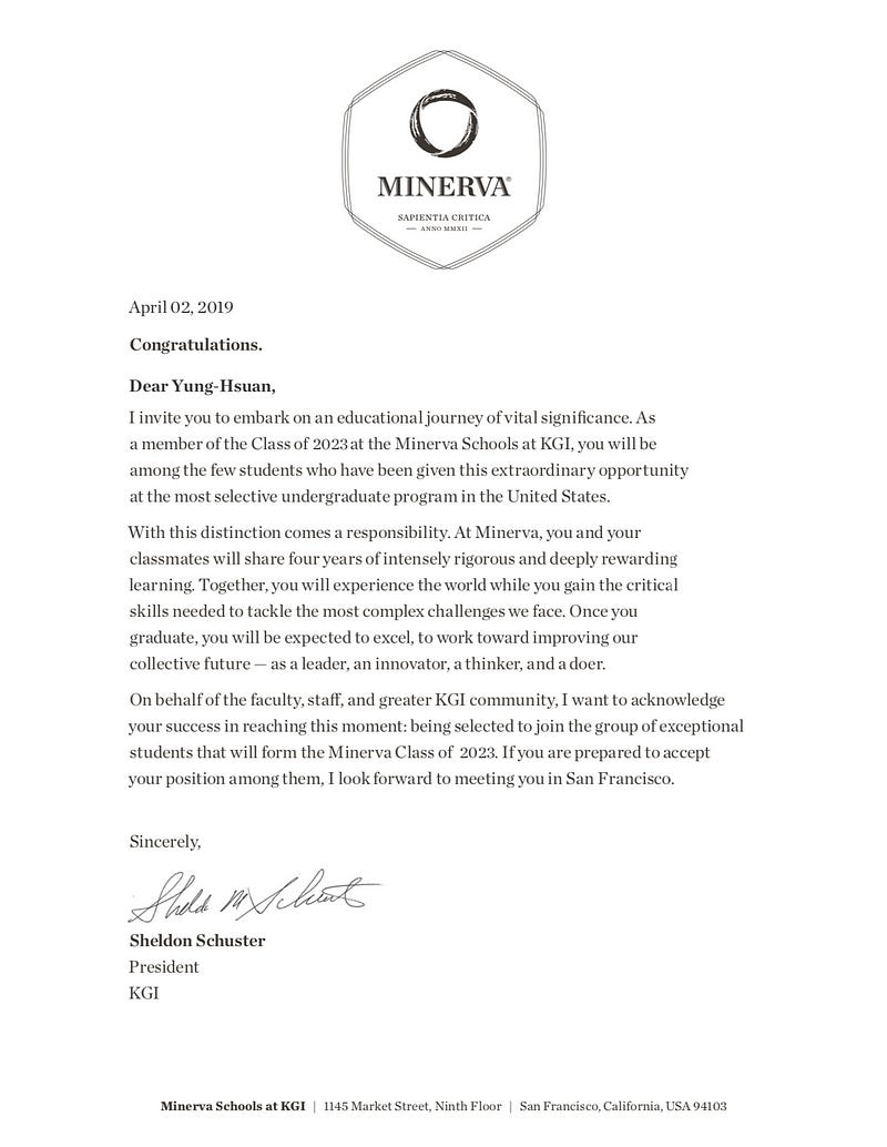 Minerva號稱全美錄取率最低的大學,新聞標題還下This college startup has a 1.9% acceptance rate, making it tougher to get into than Harvard,讓我申請的時候蠻緊張的,但也很真的感謝身邊有一群天才朋友們與我討論成就的撰寫,而我寫的六項成就是:在泰國聯合國得獎專案、吉他社環島募款、吉他獨奏表演、自學資料視覺化、創立國際交流資訊專頁、與TedxNTU的公關贊助。