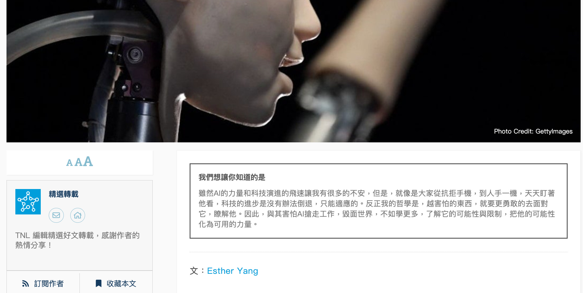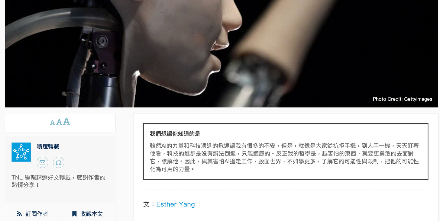 I’m happy to tell you that my writing, AI & Esther, is on local Taiwanese news!