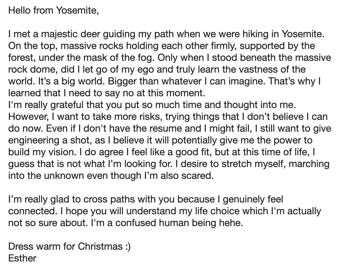 When I arrived home, I wrote an email to the most promising job that I wanted to use as a competing offer or backup. I initially wanted to play it safe, but I felt the need to forego this safe route and eliminate it from my options.