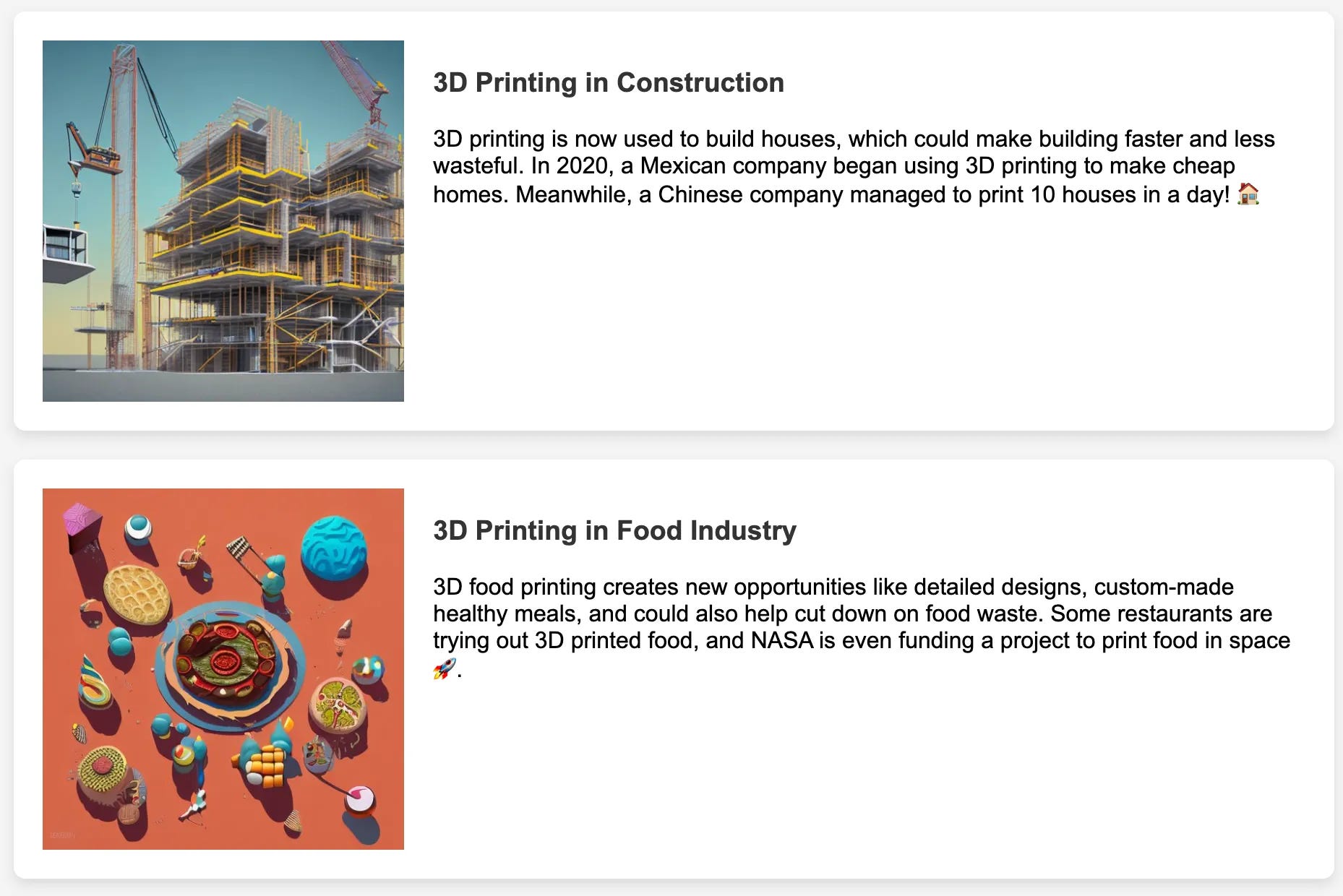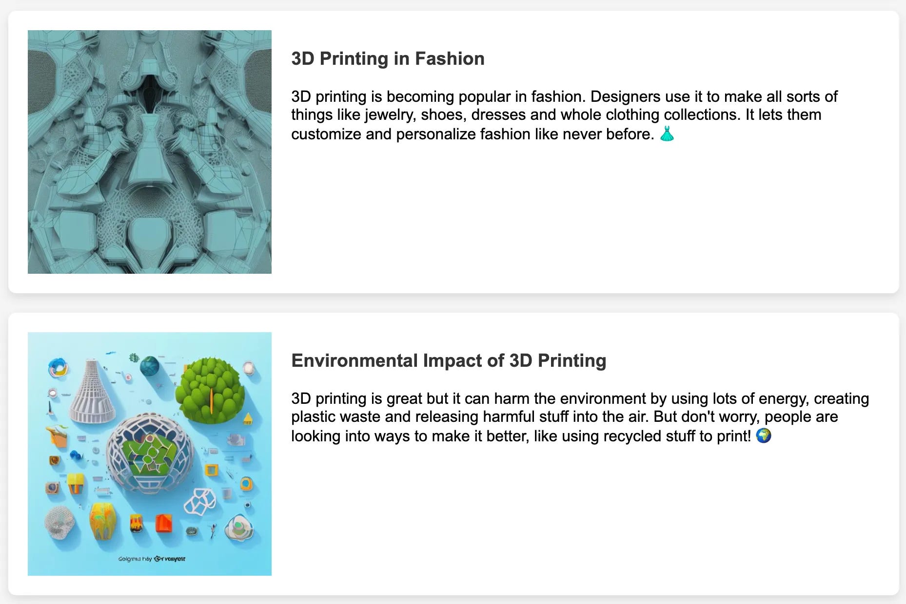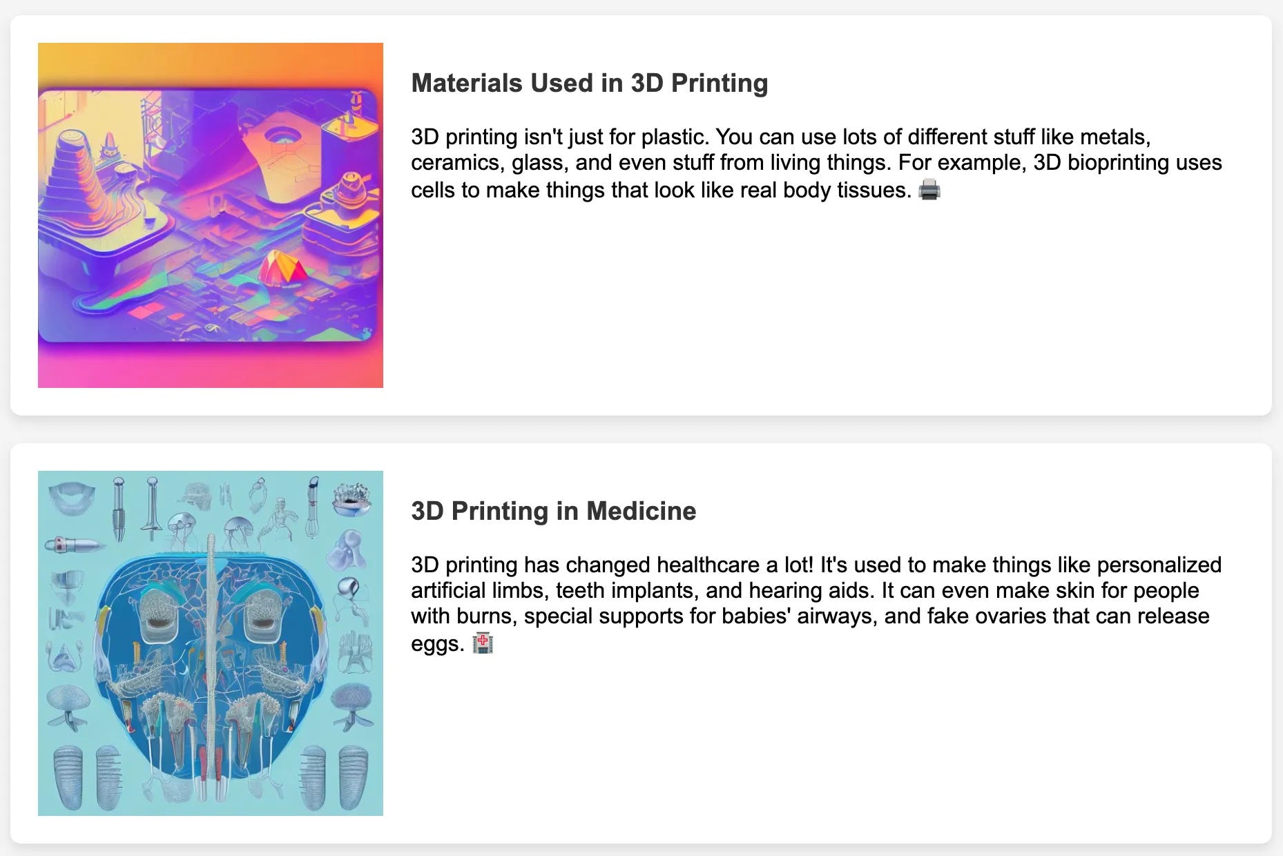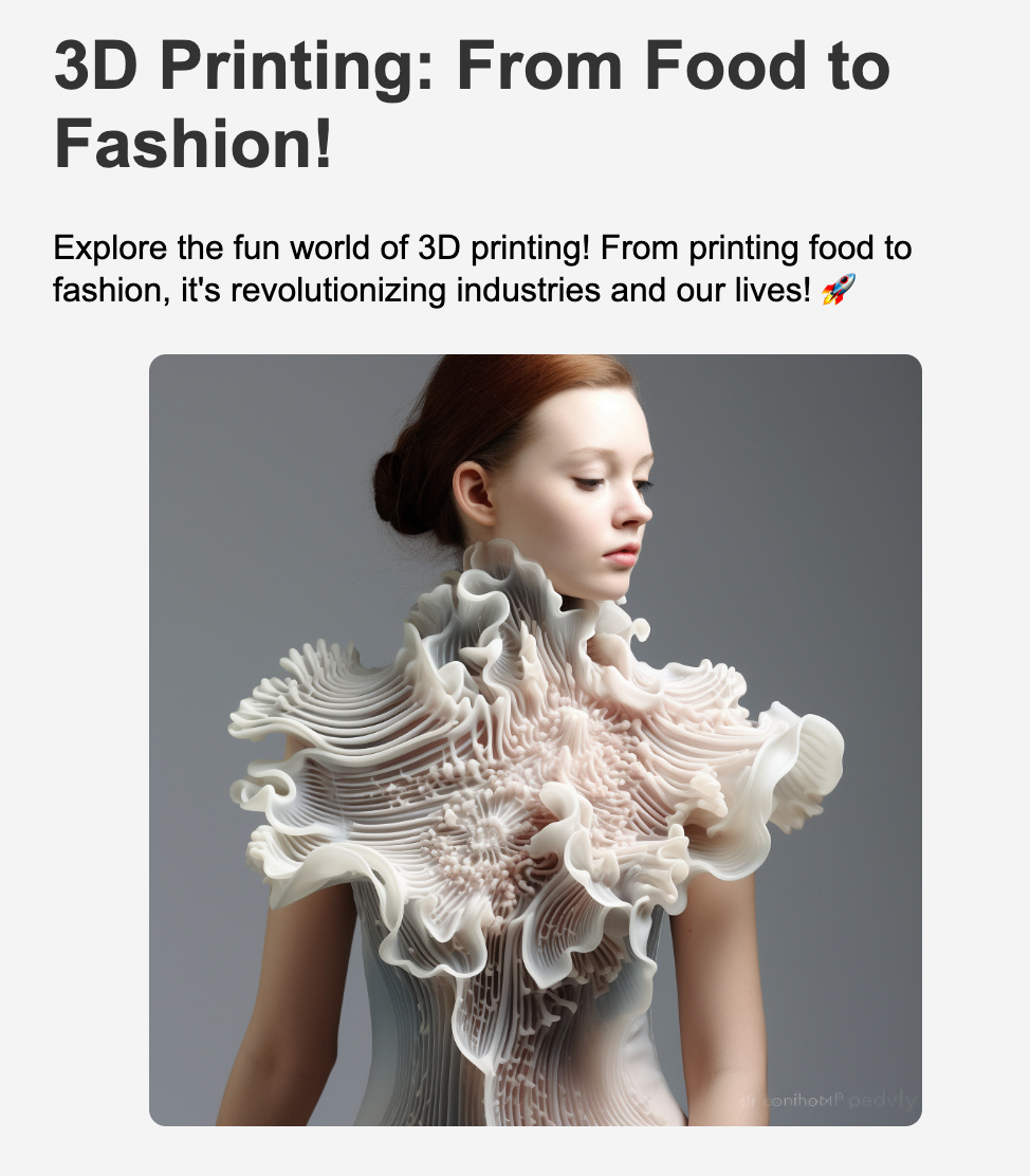 I have been working on an AI learning company for two months that provides interesting knowledge and images whenever you have questions in your mind. For example, if you want to ask about 3D printing, the AI can generate information on that topic. This is one example that AI generates.