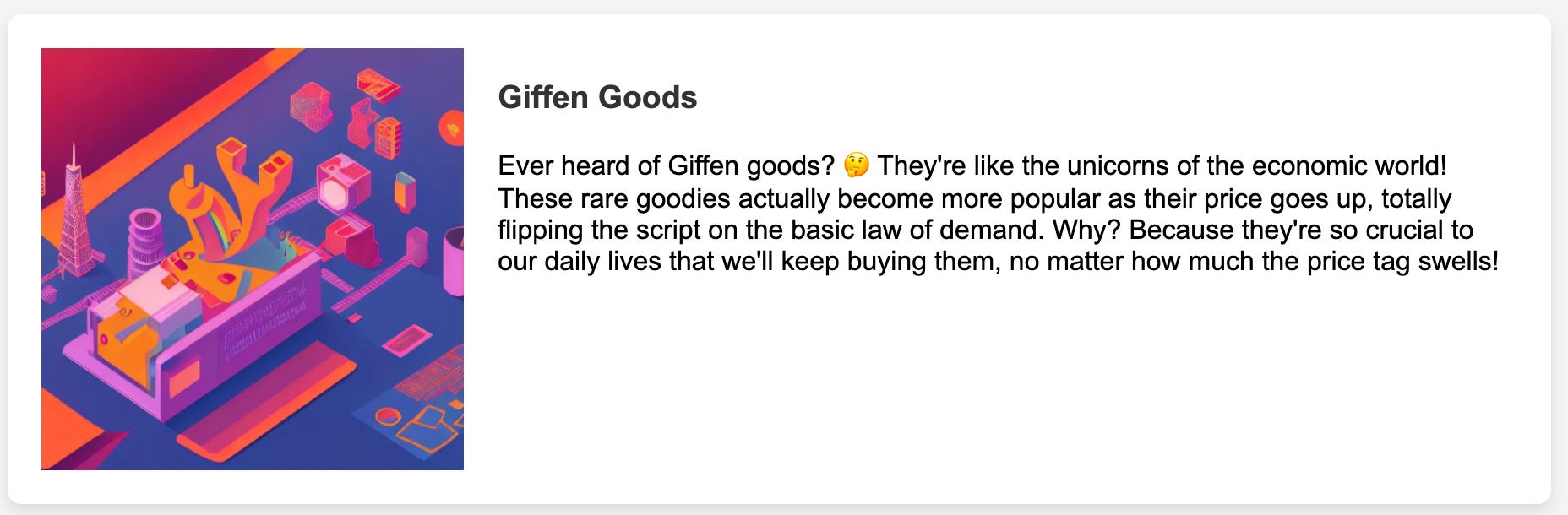 Example 1 (Top): It has the most personality with an analogy to assist understanding. However, it has filler words, such as “Ever heard of Giffen goods?”