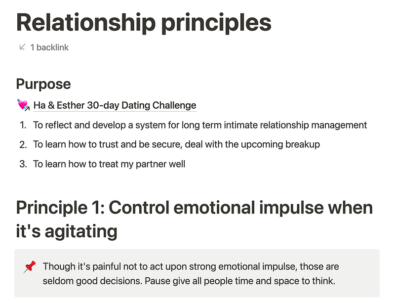 In 2021, after reading lots of mental health & relationship books, such as Attached, The Choice, Maybe You Should Talk To Someone, and The Happiness Trap, I observed my emotions from 1 min to 50 hours after a fight with my friend. I realized I didn’t have enough growth mindset for my relationship and used them to develop my relationship principles, such as controlling emotional impulses.
