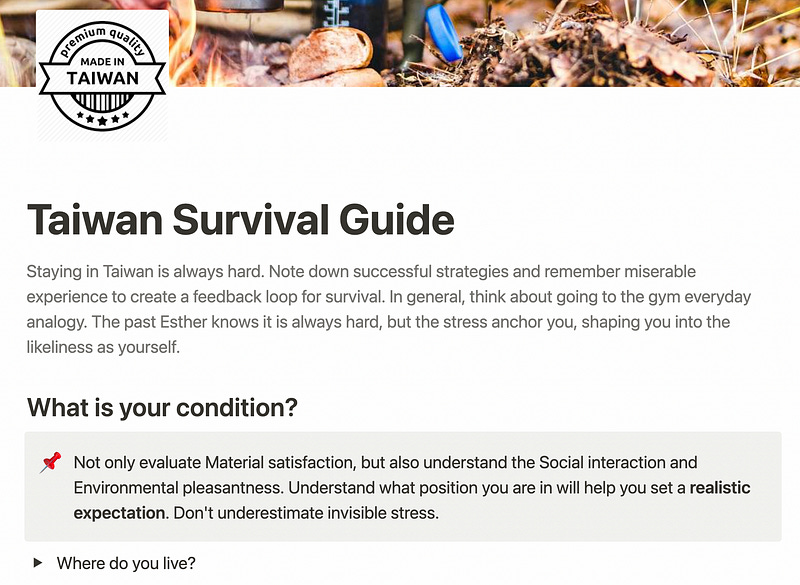 In 2020 summer, I created a Taiwan Survival Guide because I had no friends and was in bad situations with my family. I gathered some solutions with past experience that helped me.