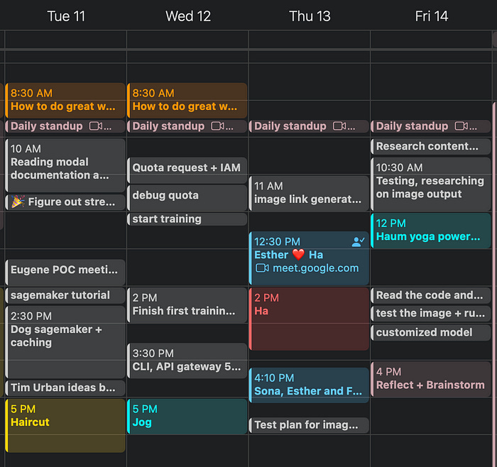 5. Time boxing when trying something new. When experimenting with new technology, there are always unexpected bottlenecks. Timing each task is the best way to determine where I get stuck and how much time I spend on each task. Although this week’s failure is disappointing, I can still see that Tuesday and Wednesday were quite productive, and the bottleneck was the same problem as last Thursday and Friday.