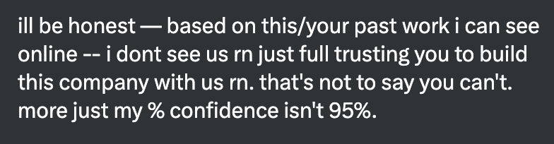 That's... that's... that's insane. I'm calling Esther "she" right now because I barely recognize myself in her anymore. That Esther back then had no idea she'd dodged a major bullet when she was humiliated - that founder ended up closing his startup simply because he got bored.