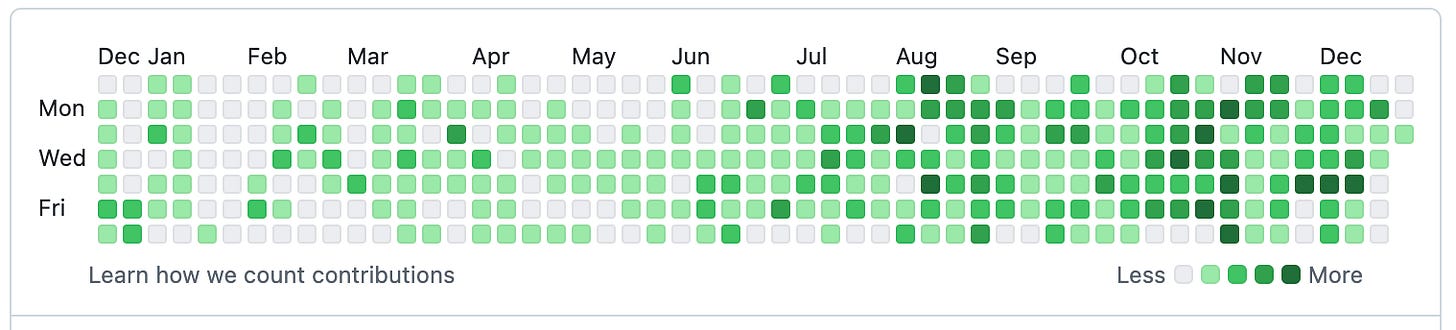 Looking at my GitHub contribution graph, I realize it's not about impressing others or proving my worth. These green squares are simply footprints of my dedication, forming a trail of discipline. And I feel genuinely proud of that journey.