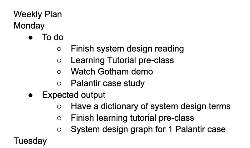 Be pushy at project planning: For planning better, I learn that planning doesn’t only include what I plan to do but also what I plan to achieve and how to do it. The template for me is: To do & Expected output, so you have something measurable by the end of every day.